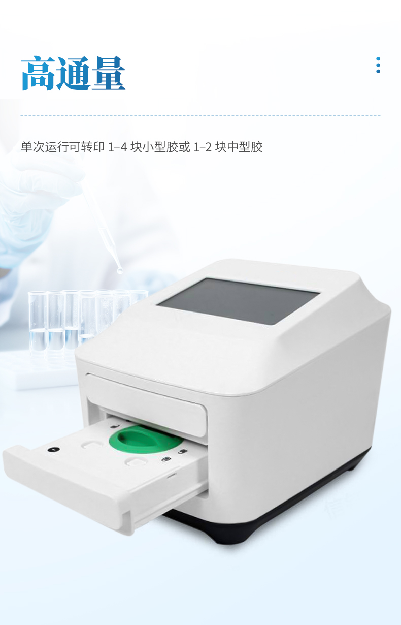 高通量 — 單次運(yùn)行可轉(zhuǎn)印 1–4 塊小型膠或 1–2 塊中型膠