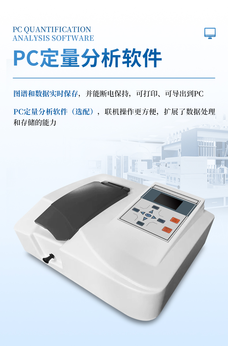 紫外可見分光光度計,功能實用,操作簡便。主機配有大屏點陣式液晶顯示器,可做光度測量和定量測試等,標準曲線圖譜直顯。選配PC定量分析軟件,增強了定量測試功能,增加了時間掃描、數據處理和報告打印等功能。廣泛應用于教學和日常分析等需求。