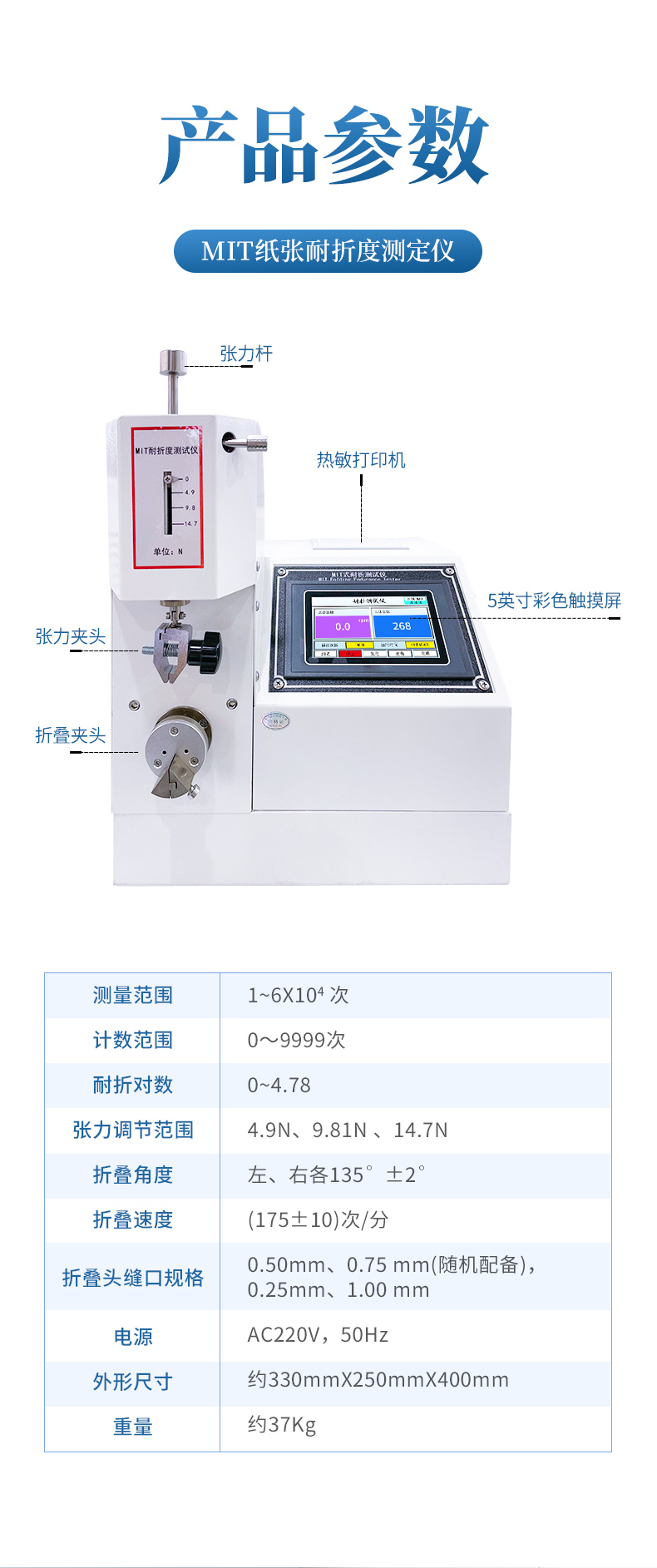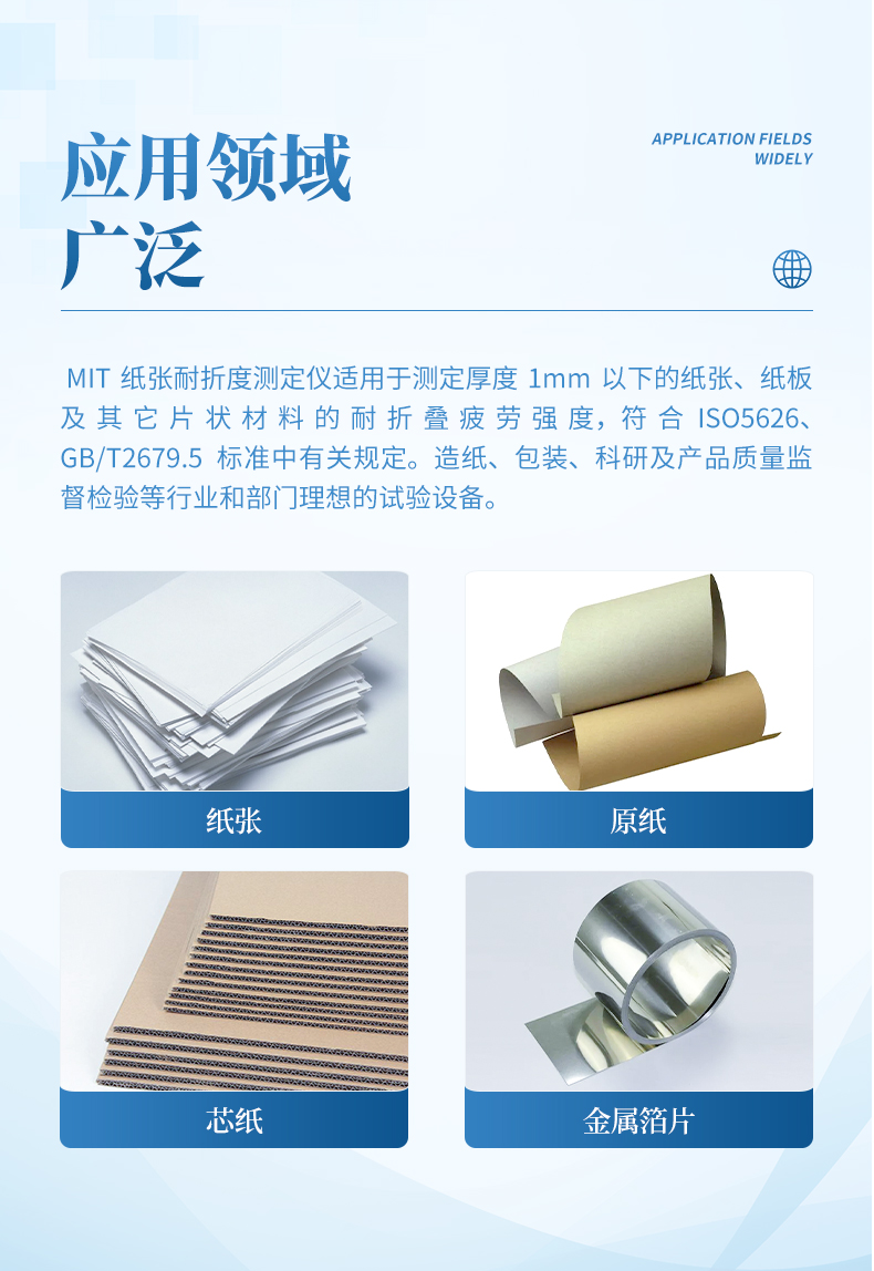 MIT紙張耐折度測定儀適用于測定厚度1mm以下的紙張、紙板及其它片狀材料的耐折疊疲勞強度,符合ISO5626、GB/T2679.5標準中有關規(guī)定。造紙、包裝、科研及產品質量監(jiān)督檢驗等行業(yè)和部門理想的試驗設備。